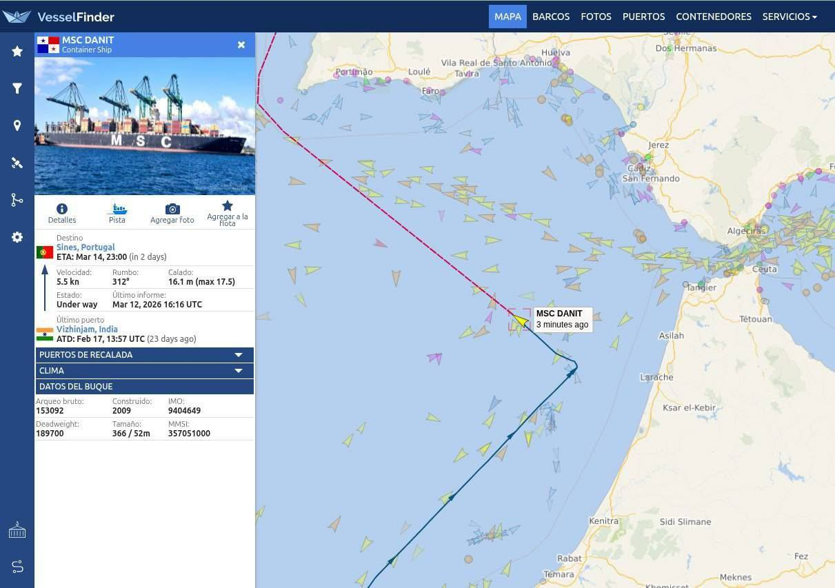 Minutos después de denunciarse las escalas previstas en puertos del Estado español de dos buques sospechosos de transportar material militar para Israel, el MSC Danit cambia de rumbo antes de pasar el estrecho, indicando dirección a Sines, en Portugal.